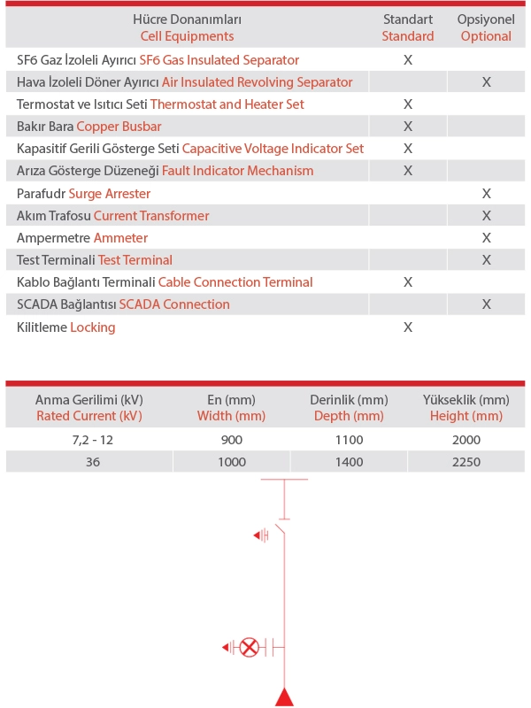 Bu hücrelerde standart olarak 3 kutuplu ve 3 konumlu (açık-kapalı-topraklayıcı olmak üzere) SF6 gaz izoleli ayırıcı kullanılmakta olup, opsiyonel olarak hava izoleli döner ayırıcı da kullanılabilmektedir.