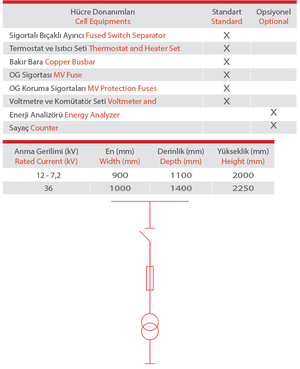 Bu hücrelerde standart olarak 3 kutuplu sigortalı bıçaklı ayırıcı kullanılmaktadır.