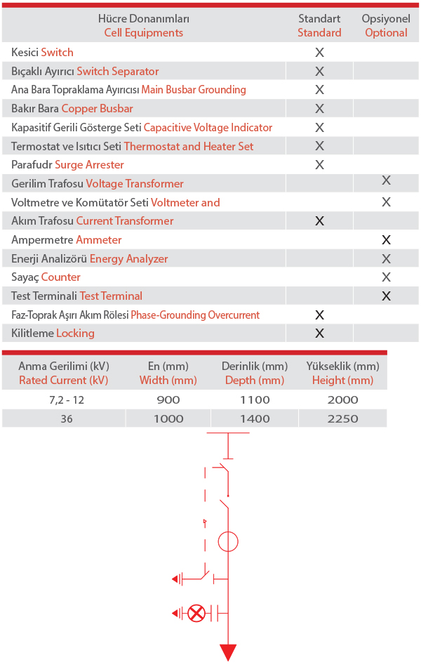 Bu hücrelerde standart olarak 3 kutuplu Hava soğutmalı bıçaklı ayırıcı ve 3 kutuplu SF6 gaz izoleli kesici kullanılabilmektedir.
