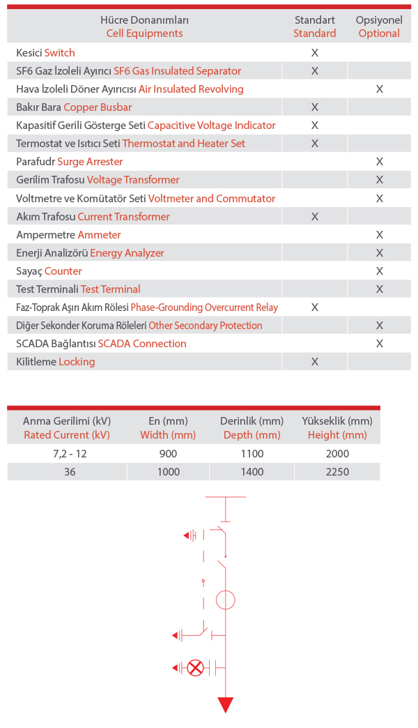 Bu hücrelerde standart olarak 3 kutuplu SF6 gaz izoleli kesici ve 3 kutuplu 3 konumlu (Açık-Kapalı -Topraklayıcı olmak üzere) SF6 gaz izoleli ayırıcı kullanılmakta olup, opsiyonel olarak hava izoleli döner ayırıcı da kullanılabilmektedir.